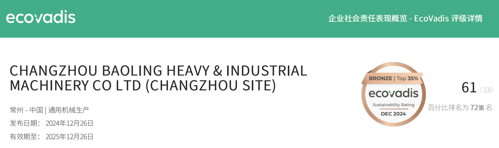 2024年12月26日,寶菱重工在EcoVadis企業(yè)社會責(zé)任評估中得分61分,并榮獲“銅牌”,在EcoVadis所有在評公司中躋身于前 35%(已超過 65% 以上的公司)。當(dāng)前,“環(huán)境、社會責(zé)任和公司治理”(簡稱:ESG)水平已成為衡量企業(yè)長期價值和可持續(xù)發(fā)展能力的關(guān)鍵因素,其核心在于“友好環(huán)境、尊重員工、合規(guī)經(jīng)營、可持續(xù)發(fā)展”。公司將可持續(xù)發(fā)展理念融入企業(yè)戰(zhàn)略與日程經(jīng)營活動中,推動導(dǎo)入ESG